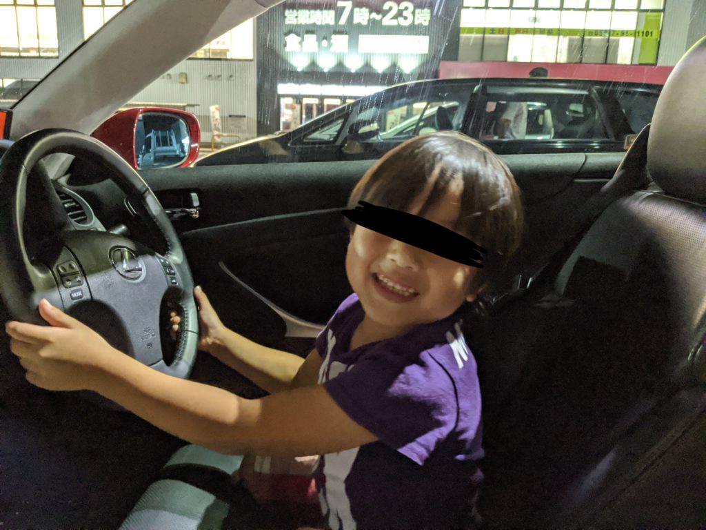 パパが買い物に行っている間に、運転席に座って運転気分の息子です。