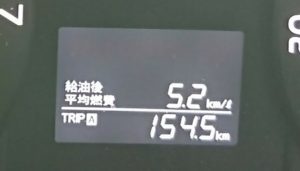 そして6カ月点検を受ける店舗まで15㎞程度走ると5.2㎞/ℓまでは上がりましたが、その間も燃料の目盛りは1つ下がっていました。