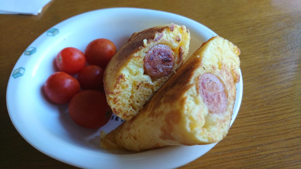 ウインナーを真ん中に置いてそこを軸に折り畳み、両面焦げないように焼いて、真ん中切ったら切り口をもう一度焼いて出来上がりっていう数分で出来上がっちゃう朝食メニュー。