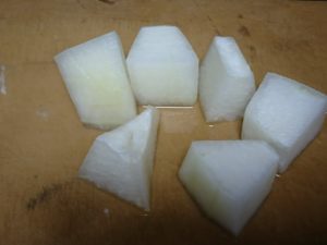 そして、皮を厚めに剥いて適当な大きさに切って鍋へ投入。