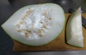 これを切るんですが、冬瓜って簡単に包丁が入らないので結構力仕事。