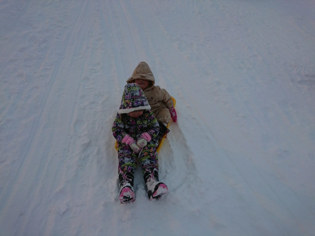 最初の内は友人に貰ったソリに二人で乗っていたけれど、一時間もするとどっちが前に座るのかで喧嘩が始まりました。