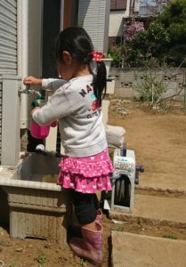 最初は蛇口を自分でひねれずにいたけれど、教えてあげるとすぐに覚えて一人でできるようになった娘。