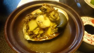 夕食の一部ですが、マタニティプランで申し込んでいるので、アワビが一人ずつ出るんですけど、私はバター焼き、旦那は刺し身でお願いしていてそんなワガママも聞いてくれる良いとこなんです!