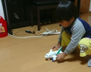 ただ走るだけじゃなくて、ボタンを押すと飛行機のアナウンスが流れたり、飛んでいる音がしたりするし、ピカピカ光ってくれるオモチャです。