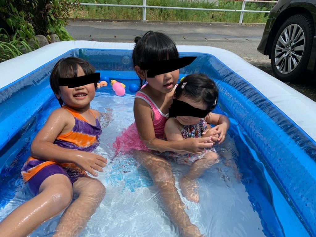 実家近所のお友達も一緒にお昼頃からプールに入れることにしました。